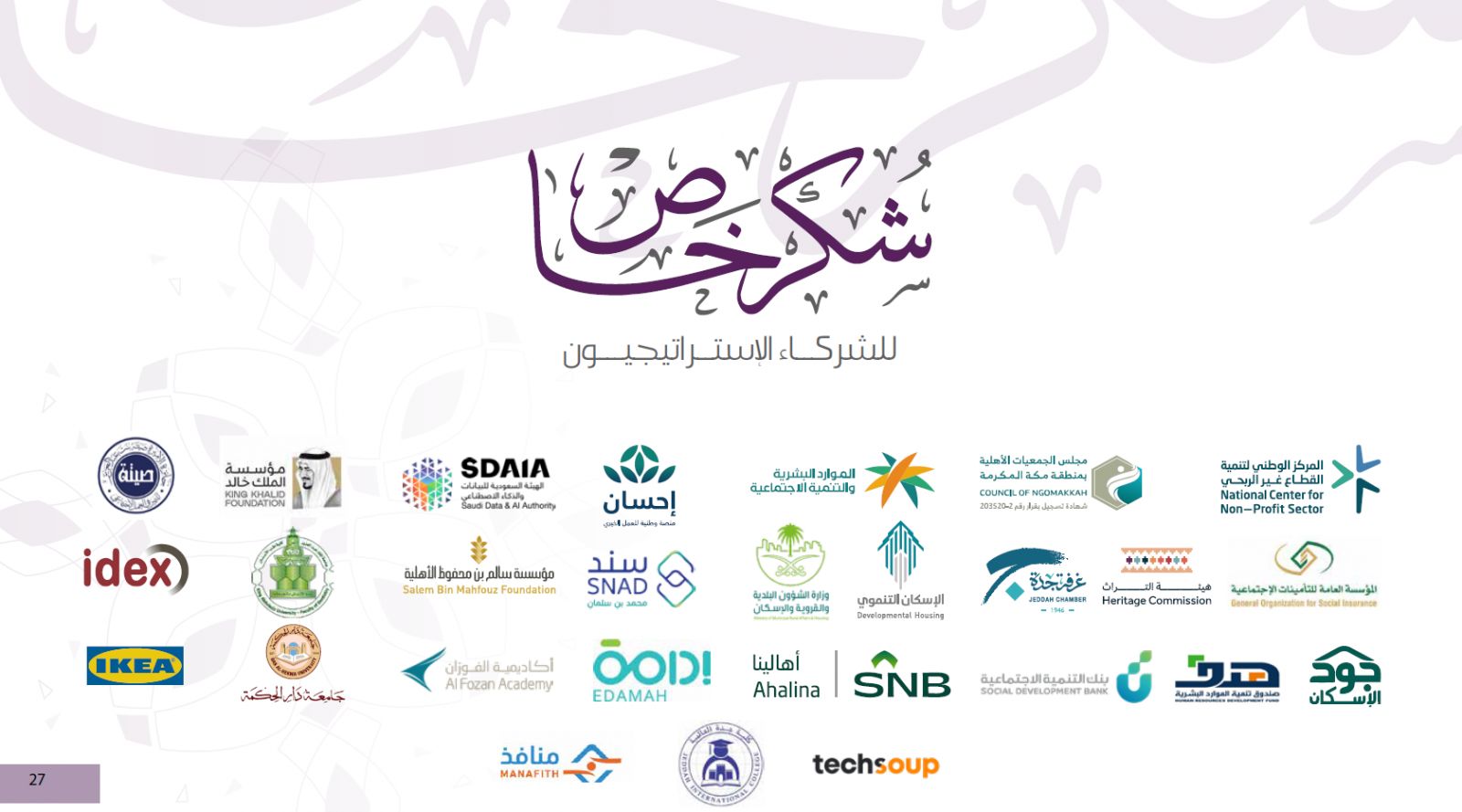 شكراً .. شركاؤنا في الأثر.. لما قدمتموه من إسهامات ومبادرات معنوية أو مادية قوية وفاعلة لخدمة المجتمع.. تهتم بتحويل الفئات التي نرعاها إلى قوة منتجة من خلال برامجنا وأنشطتنا لتحقيق التطلعات لخدمة المجتمع ورعاية الإنسان لتحقيق التكامل نحو التنمية المستدامة.